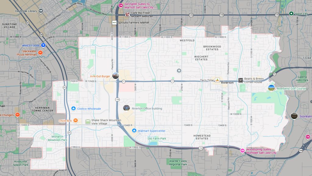 Established Riverton: Historic areas, Town Center, original residential neighborhoods. New Developments: Blackhorse, Foxboro, Harvest Park, Mountain View Corridor areas. Commercial Districts: Riverton Center, business parks, retail areas along major corridors. Recreational Areas: Properties near Riverton City Park, Jordan River Parkway
